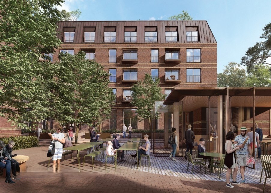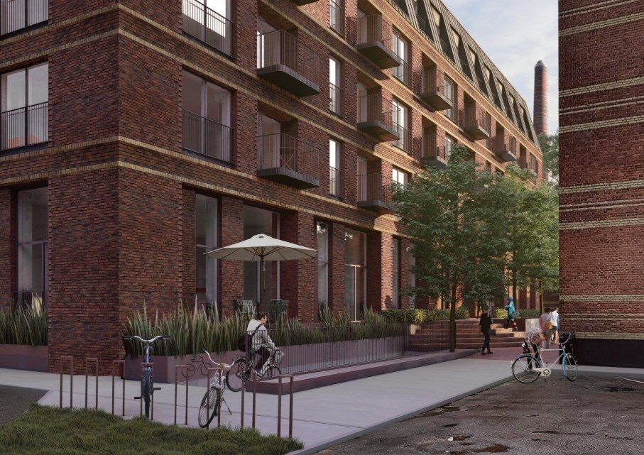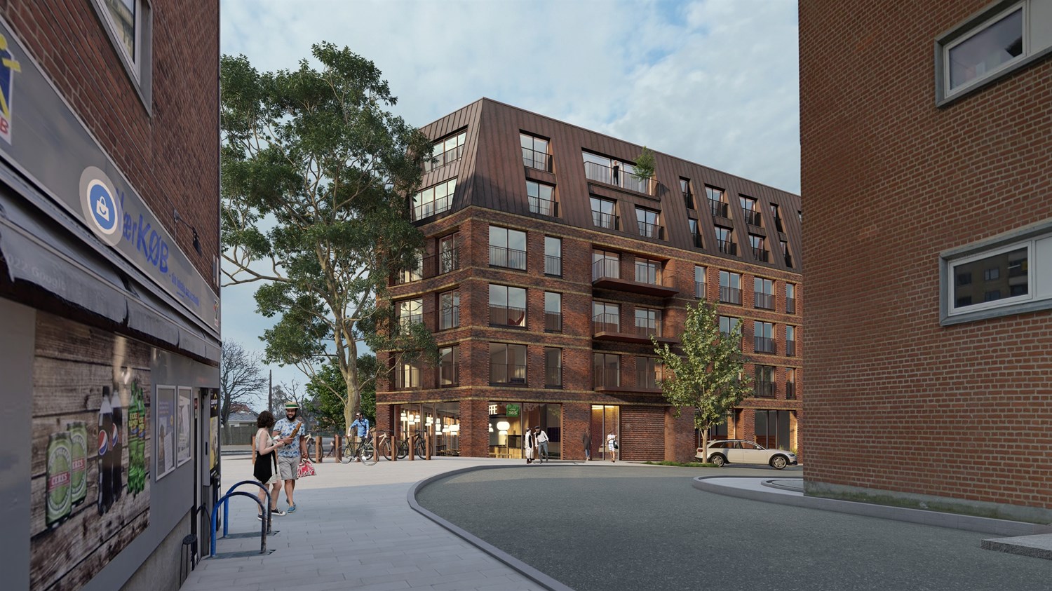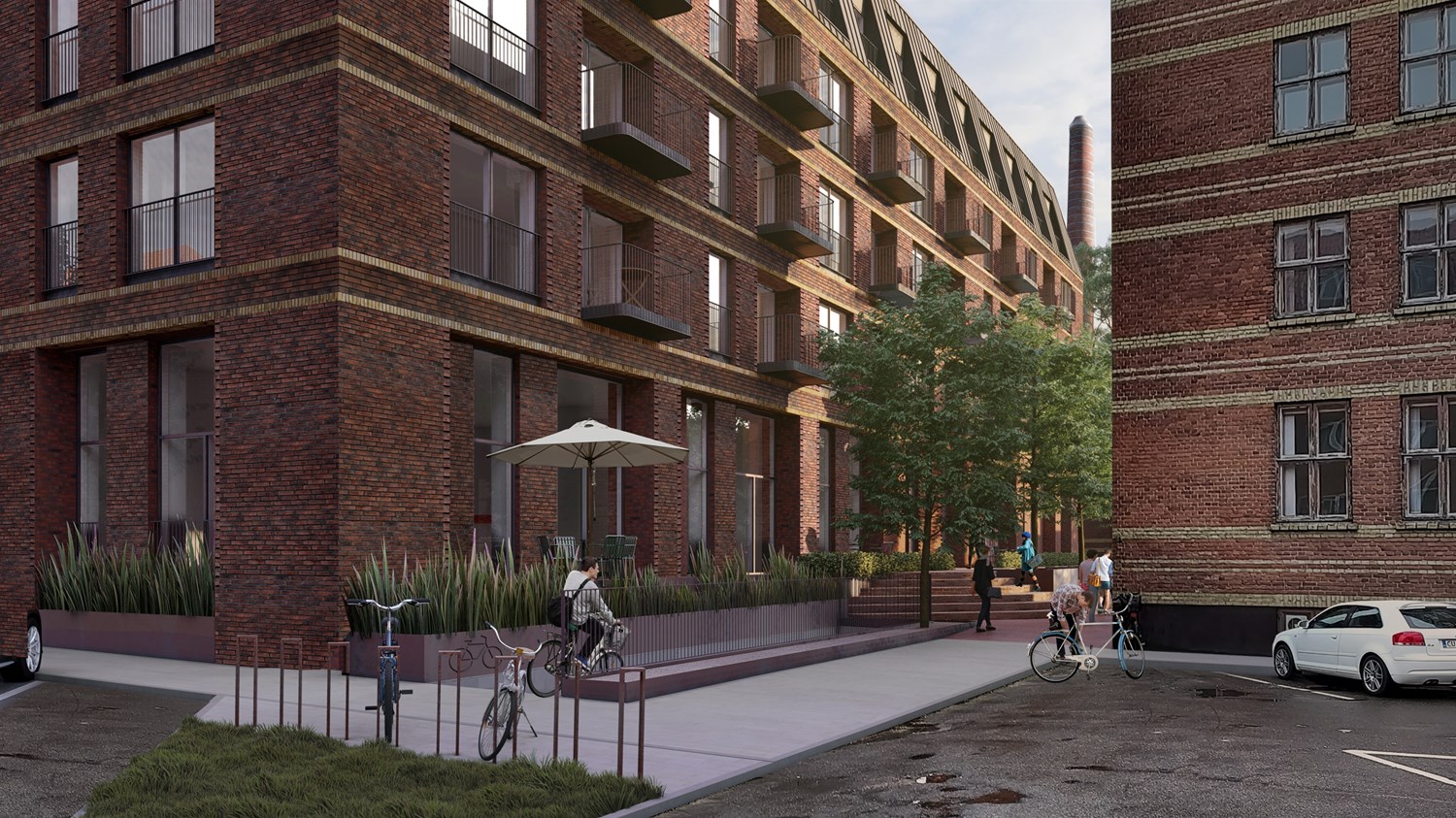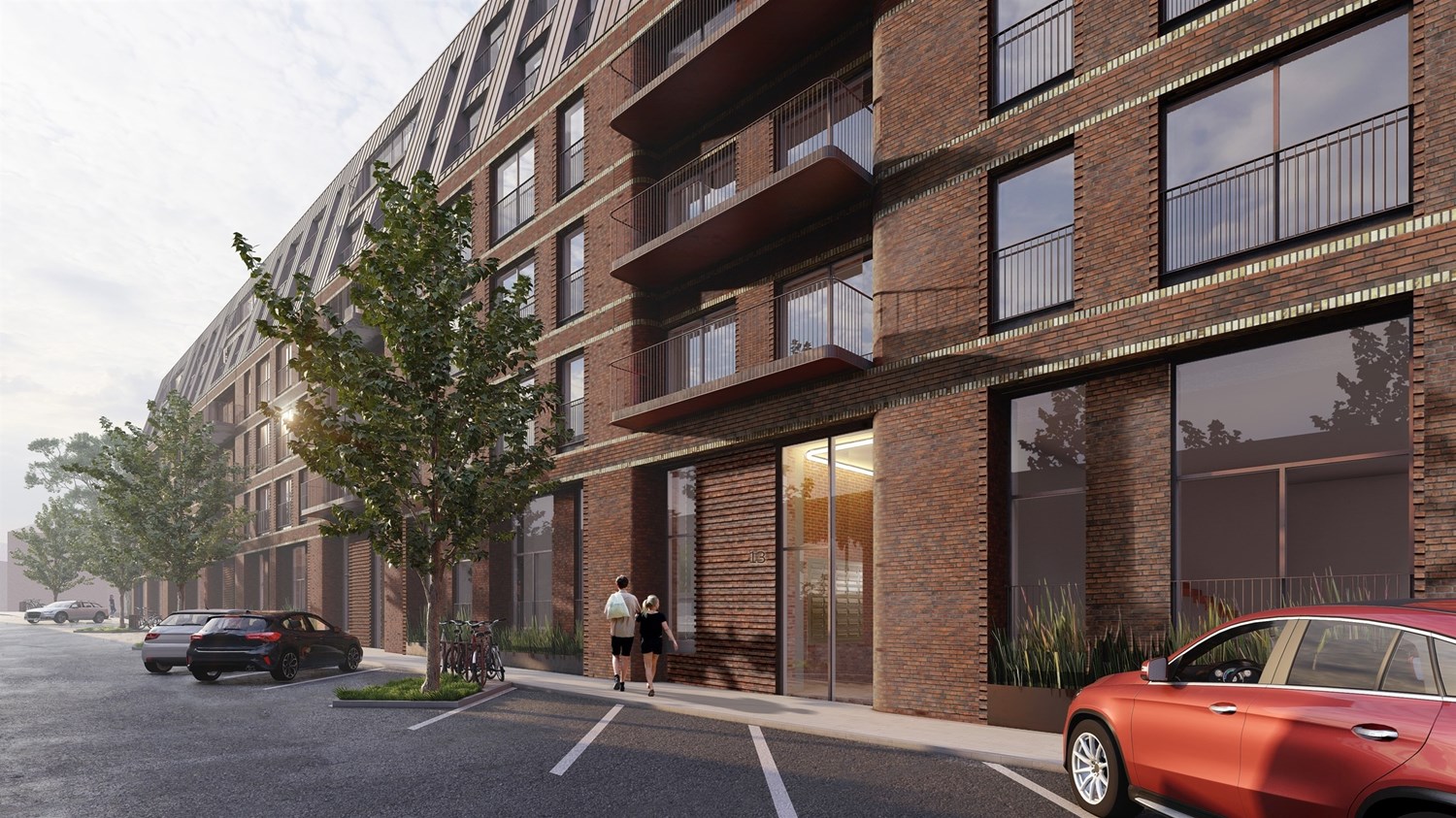 I det rød-brune murværk er der arbejdet med mønstre, tilbagerykninger, runde hjørner og gule bånd, der giver murværket en høj detaljering, særligt der hvor facaderne rammer stueetagen med indgange og omkring de private arealer på alle etager.