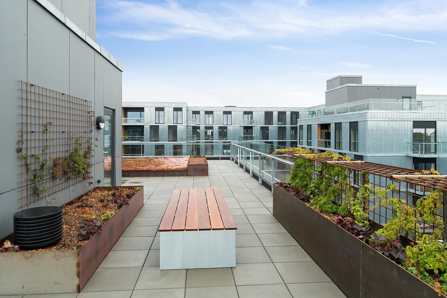 Mødet mellem beboerne er vægtet højt i arkitekturen og disponeringen af boligkarréen – ikke kun på terræn, men også i højden, hvor tagterrasser udgør endnu et fællesrum. Hævet over byen vil beboerne her have mulighed for at mødes og slappe af i grønne omgivelser.