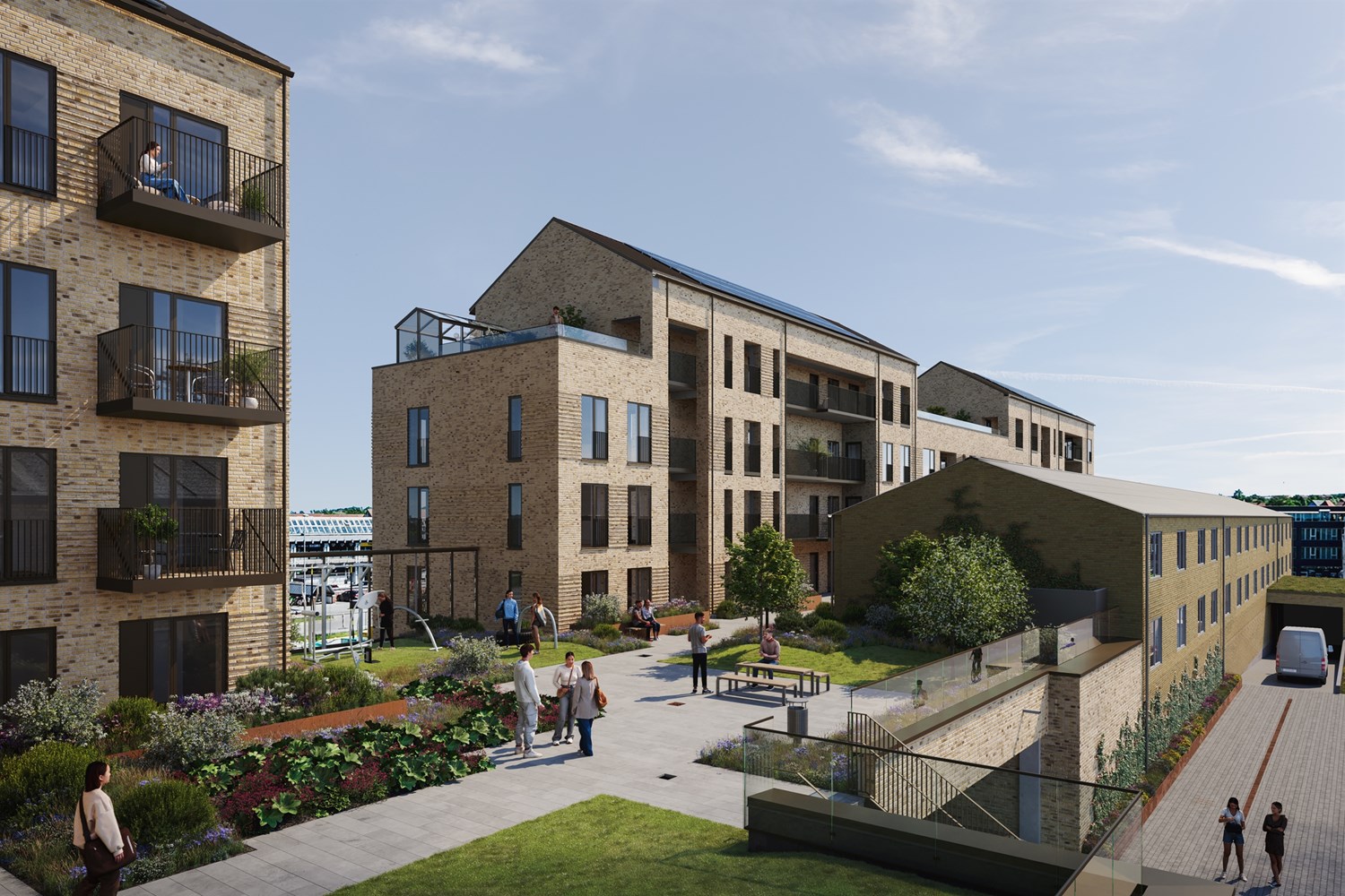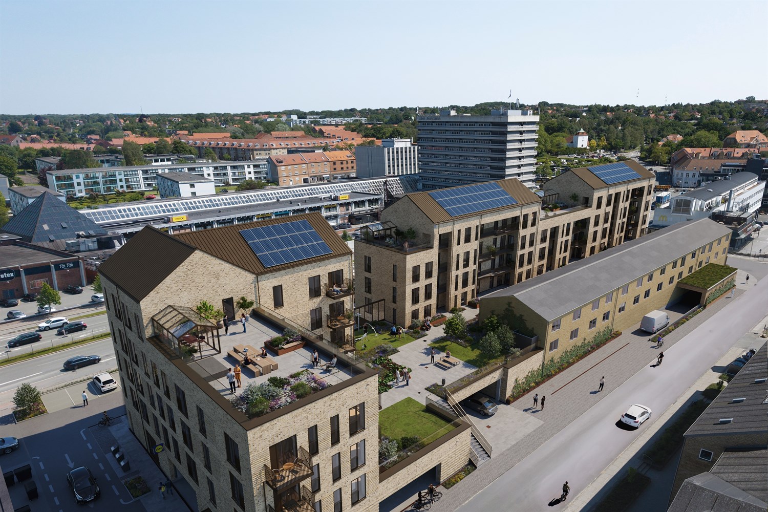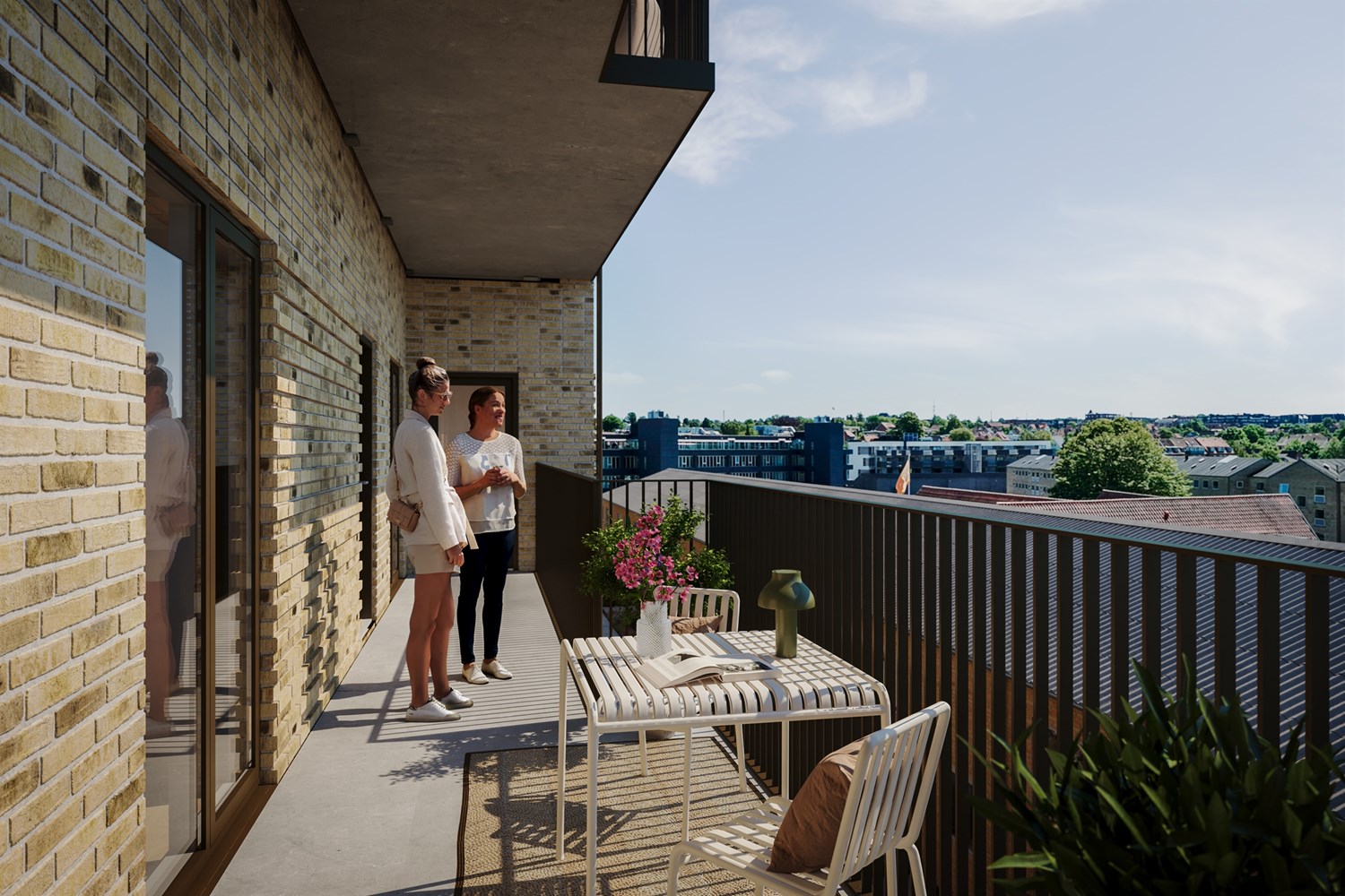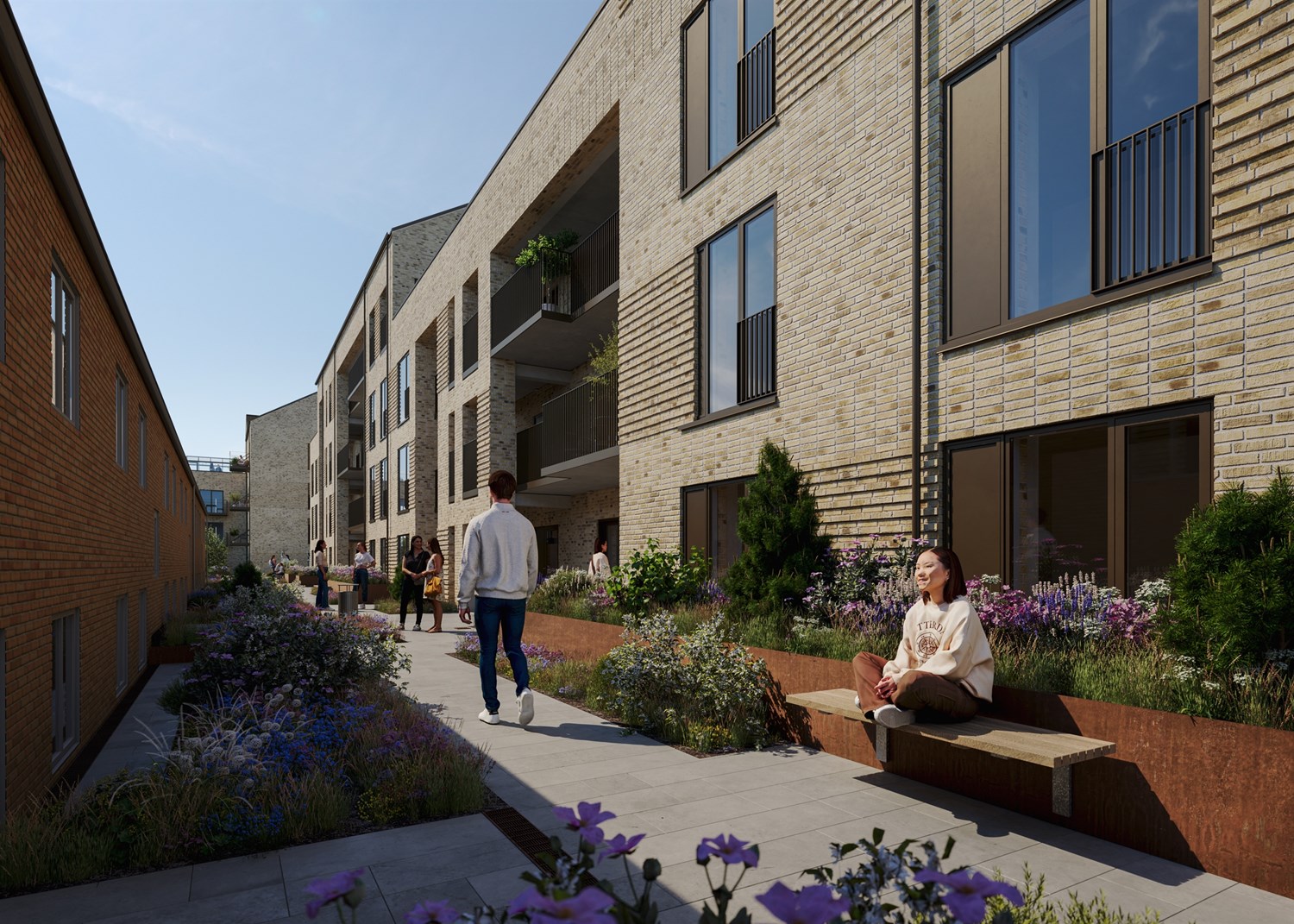 SIDE by SIDE giver et dynamisk og varieret udtryk med skiftede antal etager og forskellige tagformer. De anvendte lyse teglsten er opmuret i varierende forbandt og mønstre og skaber tekstur, der hvor facaderne møder beboerne.